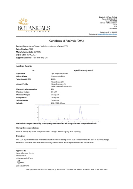 KannaStrong is an extract of Sceletium tortuosum blended with a mannitol excipient. This stimulating formulation is designed to boost energy, mood, and overall well-being.